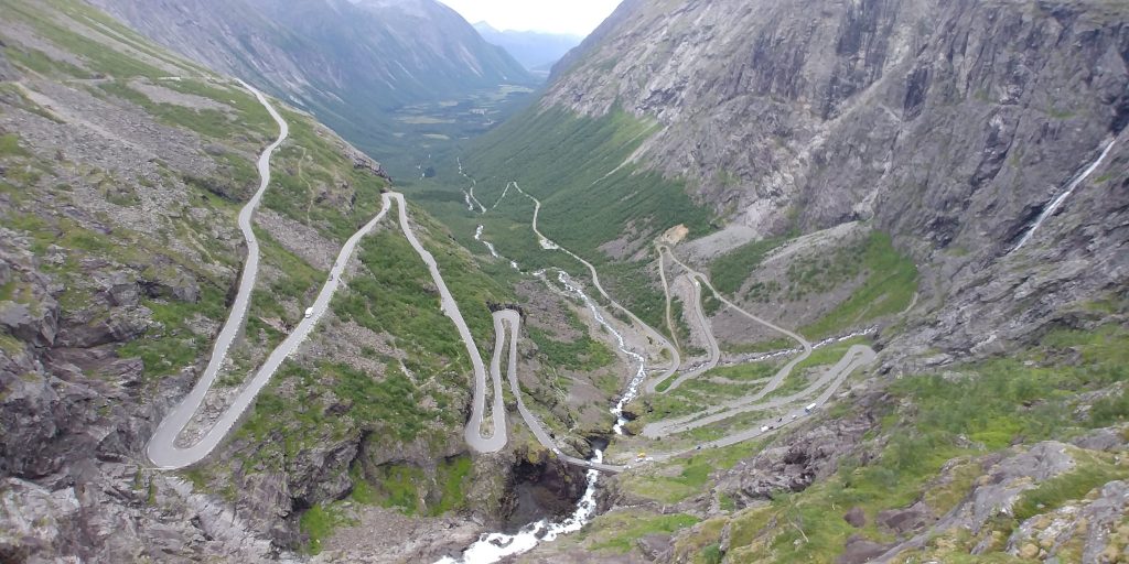 Jour 51 : Les courbatures se font ressentir et les coussinets sont usés, on décide donc de rouler pour avancer vers le Nord. Sur le chemin, on tombe sur le panneau indiquant le chemin de Trollstigen. On décide de faire ce petit détour car ce passage entre Geiranger et Andalsnes passe par le Geirangerfjord classé à l’UNESCO. Mais avant d’aller dans le fjord, il faut passer par le Trollstigen, « le chemin du troll ». Et effectivement, cette route donne des vertiges : des zigzags sur plusieurs kilomètres longeant une chute d’eau. Campi râle un peu mais finalement réussi à franchir ce passage et arriver tout en haut de la chute d’eau donnant sur un grand site avec plein de cars de touristes ! On fait aussi nos touristes et on prend le petit chemin aménagé pour arriver au point de vue donnant sur Trollstigen.