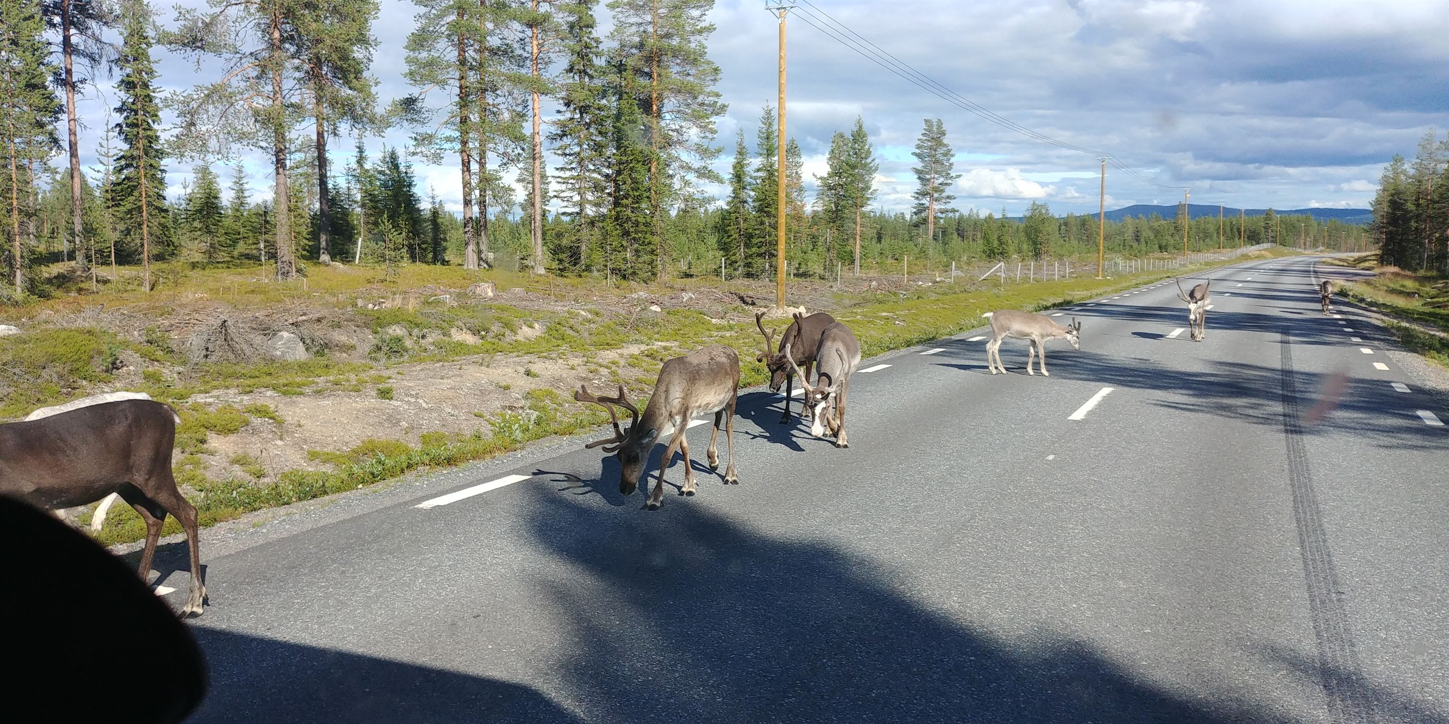 Ça change pas mal de la Norvège ! Plus de verdures, montagnes moins à pic… Mais ça fait du bien aux pattes ! Après un passage au supermarché pour refaire les stocks, quasi vidés en Norvège, on roule vers le Nord. C’est beaucoup plus facile de rouler sur les routes suédoises, elles sont plates et toutes droites. On peut faire environ 500 km dans la journée ce qui nous avance pas mal vers le Nord car il faut dire qu’on a un peu traîné dans les montagnes norvégiennes 😊 Et en plus on reprend les forces car c’est Campi qui avance cette fois-ci ! C’est donc une journée bien moins chargée que les précédentes. Je m’ennuie quasiment jusqu’à ce qu’on croise un renne sur le chemin ! Il est seul et se balade tranquillement sur notre voie et n’a pas du tout peur quand on le double et que j’aboie ! Puis quelques minutes après, un petit troupeau bloque la route. Il faut être patient avant qu’ils ne décident de libérer enfin la route. Je pense que mes aboiements féroces ont bien aidé !