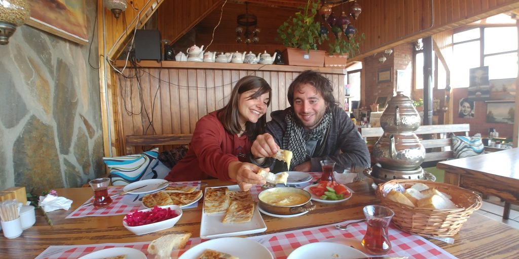 Effectivement Ankara n’a pas grand-chose à offrir si ce n’est des mosquées, des gratte-ciels et des centres commerciaux. Mais grâce à Yurdagül et Enes, on découvre quelques ruelles sympas avec des boutiques d’antiquité et des cafés traditionnels aux alentours du château. On en profite pour goûter des crêpes salées turques et de la fondue turque !